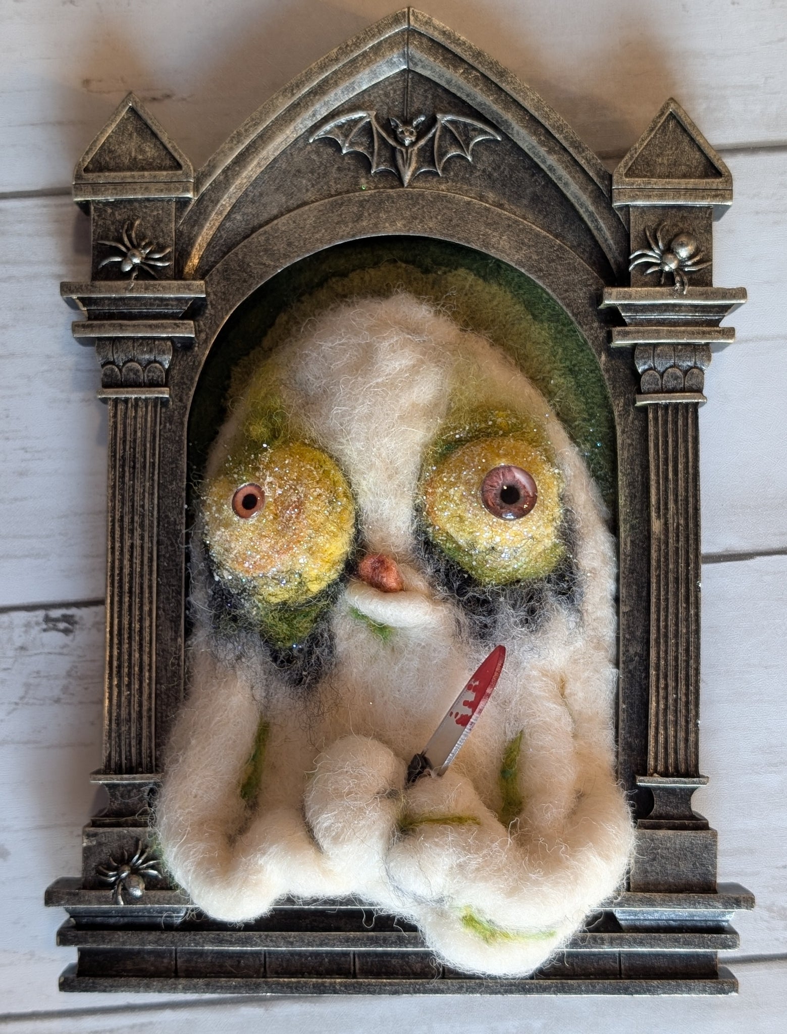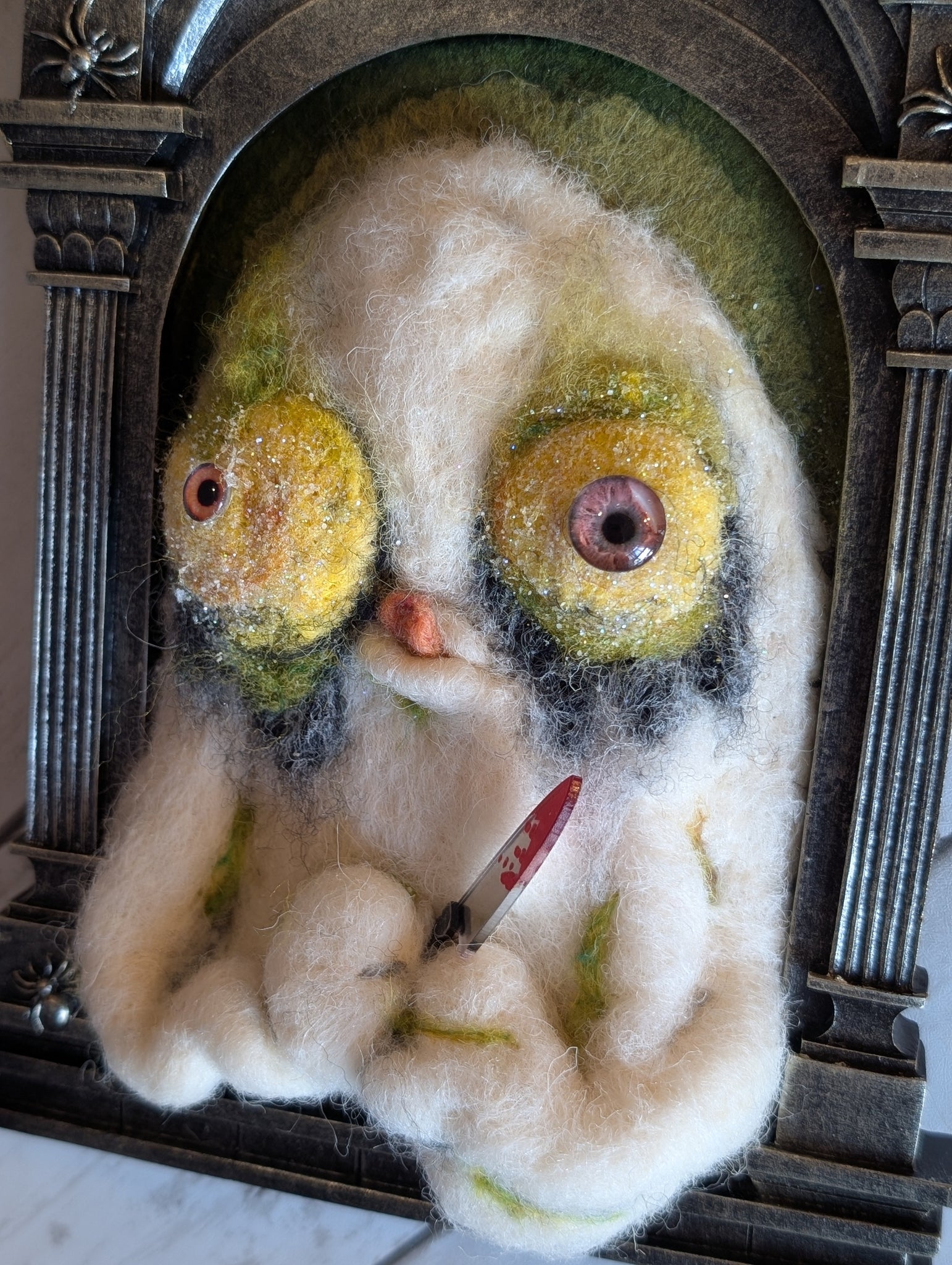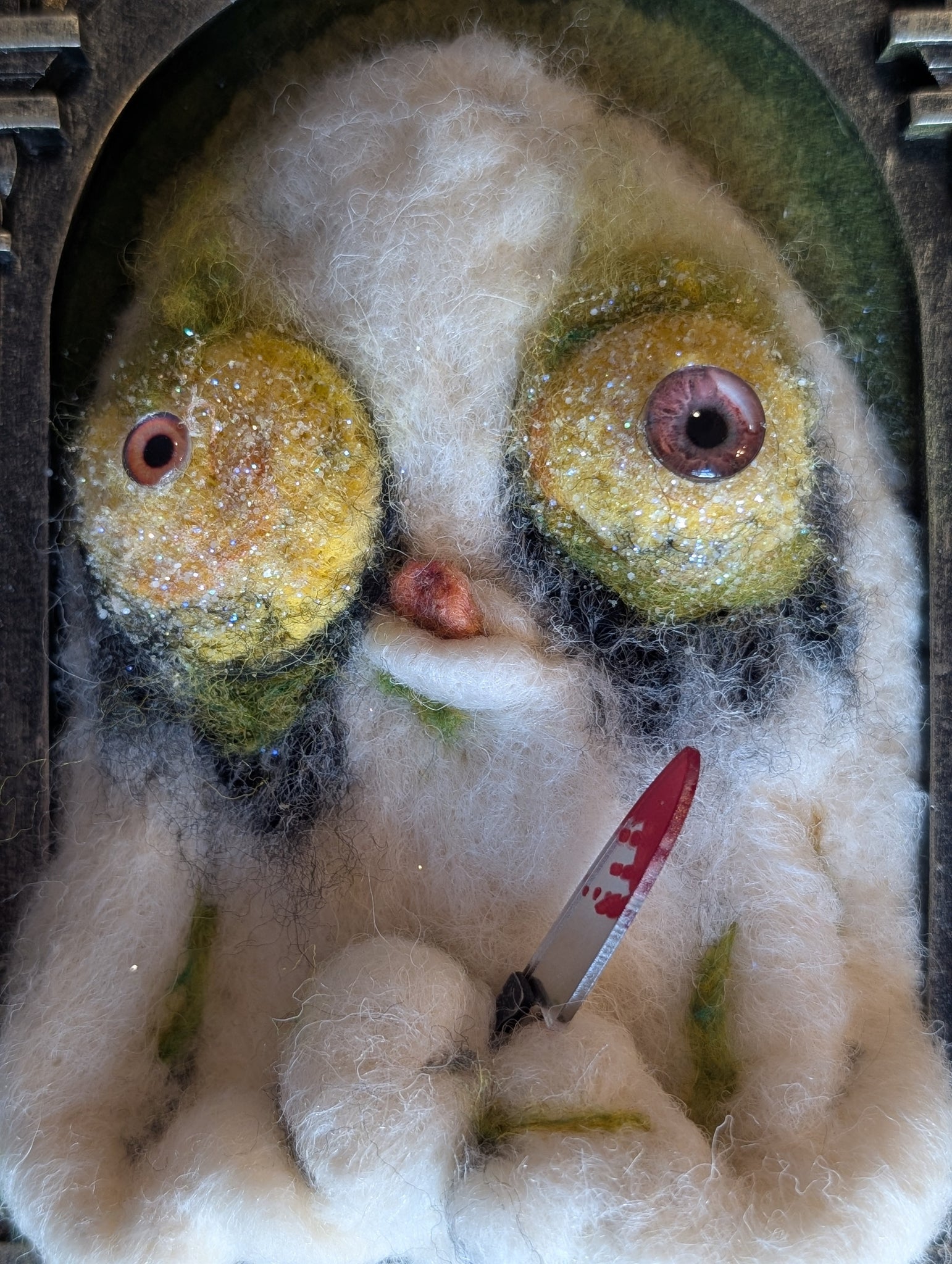 Late one Wednesday night I opened the hall closet and screamed. This ghost was hidden inside, knife at the ready, determination in their eyes. Not sure who spooked who more though, because my scream seemed to startle the poor Boo. We got to talking and I think they're harmless enough. Just typical ghost antics, and who doesn't need some of those this time of year?